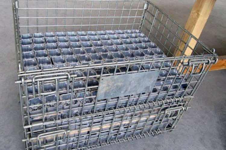 铁丝笼的主要原材料是高线拉成的钢丝,一般丝径是5mm,6mm,6.4mm。网片焊接的网目间距一般为50×100,100×100,50×50。仓储笼底部采用U型钢焊接而成,U型钢是冷轧带钢轧机轧制而成,底部四角采用冲压件一次冲制而成。铁丝笼采用Q195高线作为原材料,经冷拔成型材。再通过碰焊形成半成品网片。在制作成网片后,可采用镀锌或喷塑进行表面处理(铁丝笼大多数采用镀锌处理),表面处理完毕后就可以进行组装,即可制作成成品。